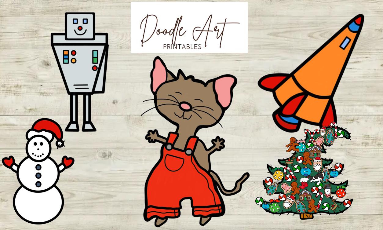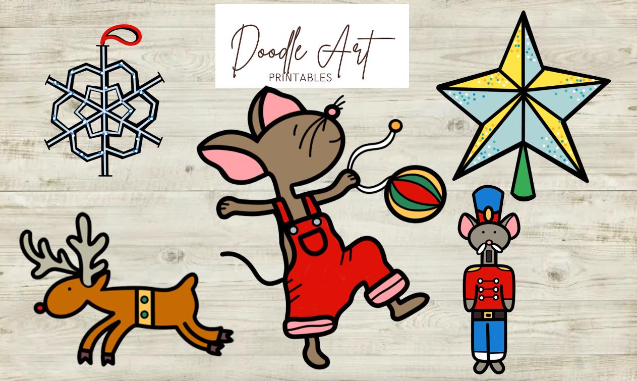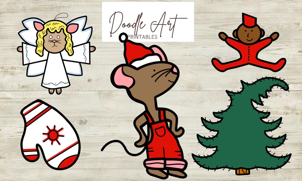 * Mouse (3 poses) * Tree * Tree topper * Reindeer * Snowflake * Elf * Robot * Rocket * Nutcracker * Snowman * Angel * Mitten * Ornament